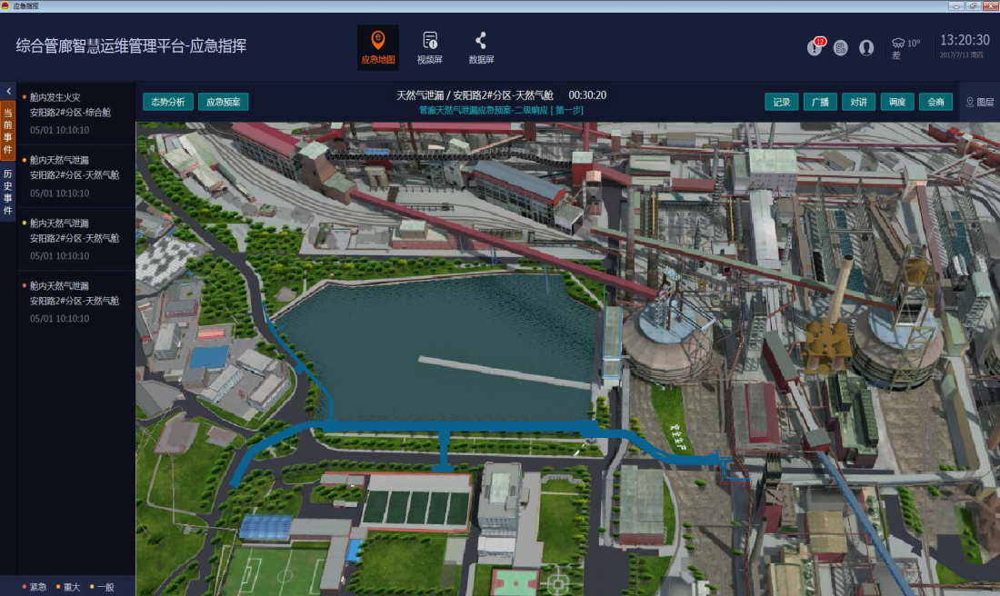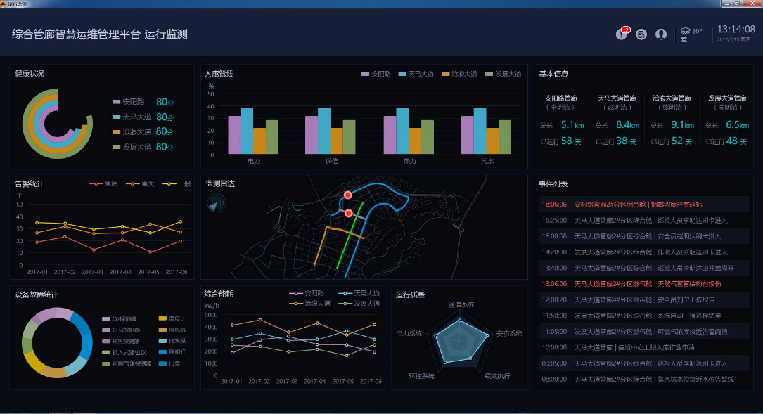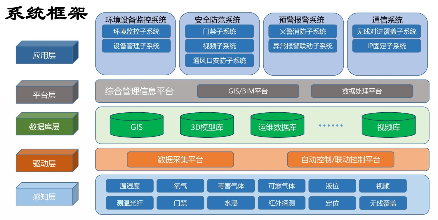 基于物聯網技術,集成了3D可視化技術、傳感感知技術、大數據云計算技術、輔助決策技術、無線通信技術、自動控制技術,能夠實時對管廊內環境及各種主管線運行的數據進行顯示、分析、更新、維護、統計,全方位地支撐了管廊權屬單位的日常運營、維護、管理以及突發事件發生時的應急處置。